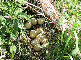 After a tom and hen have mated, the female looks for a nice place to make a nest, while the tom goes looking for another female to mate with. The nest is made in a shallow hole with lots of brush and shrubs around. There are 10 to 14 eggs, and the hen sits on them for 28 days. The baby turkeys, which are called poults, can already leave the nest in just 12 to 24 hours.